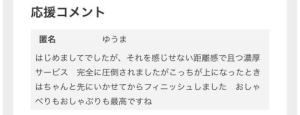 4月19日12時過ぎに店頭指名したYです。すごくイチャイチャで甘えん坊な方で、ずっとギュウッてしてました。時間ギリギリまでイチャイチャしまくってましたね。また指名させていただきます。ありがとうございました(*´ー`*)