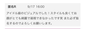 アイドル級のビジュアルでした!スタイルも良くてお顔がとても綺麗で凝視できなかったです笑 また必ず指名するのでよろしくお願いします。