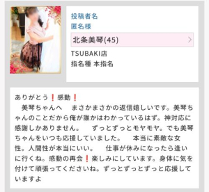 美琴さん、今日はありがとう。前回の温もりが忘れられず、初めて本指名させてもらいました。これからどんどん寒くなるので、お互い温もりあって過ごせたら嬉しいな。