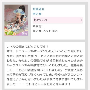 昨年、リニューアルオープンしたということで 遊びに行かせて頂きましたが サービス内容は他の店舗とさほど変わらないかなという印象ですが 今回指名したもかさんのルックスレベルが高すぎてびっくりしました。 性格も優しく、こちらの要望を聞いてくれました。 今後は人気が出て予約が取りづらくなってしまいそうなので コメントを控えようかと思いましたが 我慢できずに書いてしまいました・・・ それほどいい女性だと思います!