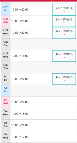 | 10:00→22:00 | 10:00→22:00 | 10:00→18:00 | 10:00→22:00 | 10:00→17:00 |