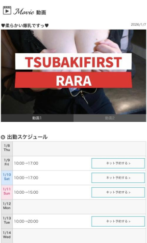 お顔は可愛くてちょっと童顔 スタイルは抜群に良くて俺の基準ではSクラス ウエストが細いのでFカップだけどカップサイズ以上の迫力。 お尻は張りがあって太股はほど良いむっちり感で、圧倒的なえっちぃ身体つきの女性でした。 プレイは密着しての【イチャエロ系】 イチャイチャ系は一般的ですが、エロが入る、ららさん 甘々なんだけどプレイはしっかりエロい、さすがツバキファースト店 テクも良いけど、ねっとり味わうようなエロさは人妻ならでは。 むしゃぶりつく、と言う表現がピッタリの濃厚プレイでした。 最後にスタッフの皆さんの丁寧なご対応にも居心地がよかったです